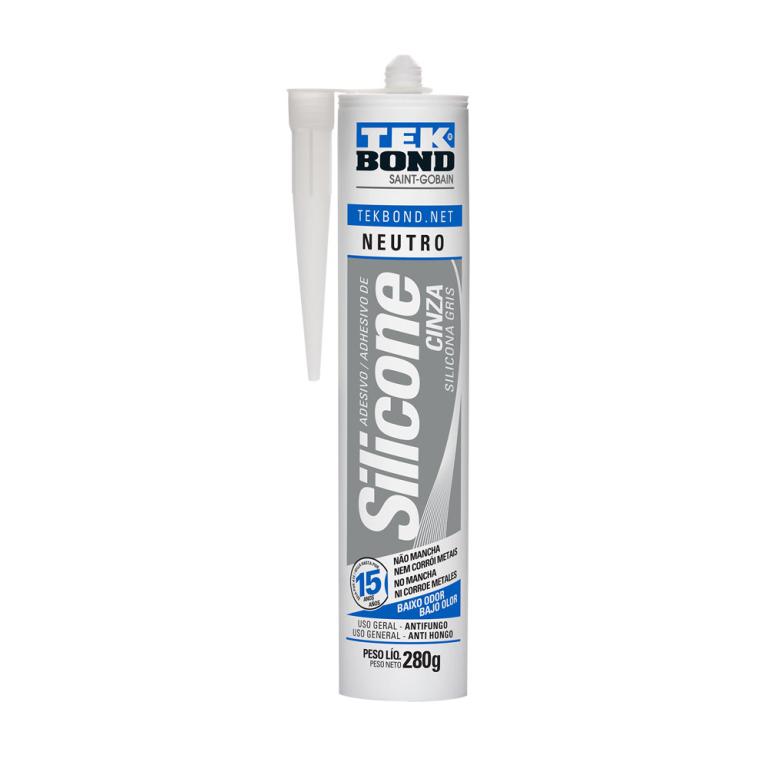 SILICONE NEUTRO CINZA Pode ser aplicado para a maioria dos substratos porosos e nao porosos, possui excelente resistencia a variacoes climaticas como temperatura, chuva e raios UV. Podem ser aplicados em substratos porosos, nao porosos e metais corrosiveis, como por exemplo: Concreto, alvenaria, pedras e ceramicas; Madeiras e metais; Vidros comuns, temperados, laminados, aramados e espelhos. Alguns tipos de plasticos; CARACTERISTICAS: E um adesivo selante tixotropico monocomponente, medio modulo, anti-fungo e de cura neutra. Sua cura ocorre em temperatura ambiente e na exposicao a umidade do ar. MODO DE USO: 1. As superficies de aplicacao devem ser limpas com alcool ou acetona, secas e firmes. Nao utilizar querosene ou gasolina para a limpeza das superficies. 2. Aplicar fita crepe para proteger as areas onde nao se deseja aplicar o silicone. 3. Cortar a ponta do cartucho e cortar o bico aplicador em um angulo de 45 no tamanho e espessura desejada. Rosquear o bico no cartucho aplicador e colocar na pistola aplicadora. 4. Aplicar o silicone na area desejada e fazer o acabamento. 5. IMPORTANTE: logo apos a aplicacao do silicone, remover a fita crepe antes que o adesivo forme a pelicula. 6. Apos o uso, mantenha o bico aplicador no cartucho e deixe uma pequena quantidade de produto acima do bico para formar um tampao. Na reutilizacao, retire o tampao. Apos aberto reutilizar o produto em ate duas semanas. LIMITACOES DE USO: 1. Para todas as superficies que eliminam oleo, plastificantes ou solventes, como madeira imersa em oleo, e a superficies quando estao molhadas. 2. Para o substrato com temperatura superficial superior a 50 C ou aplicar em temperaturas abaixo de 5 C. 3. Para areas fechadas ou areas confinadas onde a cura pode ser afetada pela falta de umidade. 4. Para situacoes como imersoes em agua por um longo periodo de tempo. 5. Para superficies que tenham contato direto com alimentos. 6