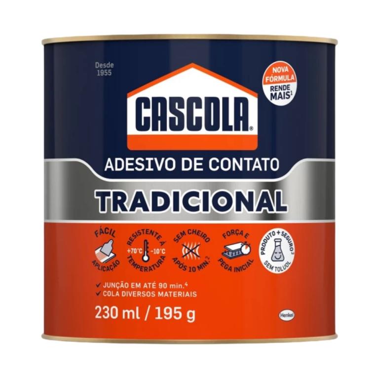 CASCOLA Cola de Contato Tradicional é uma cola de contato de alto desempenho, ideal para diferentes materiais e aplicações. Sua nova fórmula que oferece rendimento 20% maior que a fórmula anterior¹, mantendo a qualidade e performance. Sua fórmula sem Toluol, garante maior segurança para saúde do profissional. Indicado para colagens de lâminas decorativas, couro, lambris e diversos materiais sintéticos sobre materiais como madeira, compensado, aglomerados, MDF, HDF, concreto, cimento etc. ¹Rendimento superior em comparação à formulação anterior. Antes: entre 250 – 300g por m². Agora: entre 200 – 250 g por m². Teste de rendimento realizado em substratos de MDF e compensado naval.
