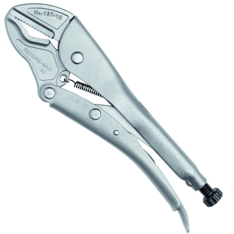 Mordentes em aço Gedore-Vanadium e demais componentes em aço especial. Corpo com acabamento niquelado e cromado e parafuso de regulagem escurecido. Em função do desenho exclusivo de seus mordentes, “Gedore-Grip” prende materiais com vários formatos. Possui parafuso de ajuste e alavanca de liberação.