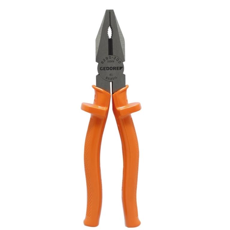 Corpo em aço Gedore-Vanadium e empunhadura em polímero anti-chamas na cor laranja padrão Gedore. Acabamento escurecido e faces lixadas. Empunhadura ergonômica e antideslizante, com abas protetoras arredondadas para maior conforto e segurança. Produzida por injeção, propiciando isolação até 1000 V, conforme norma NBR 9699, submetida à ensaios de: impacto, tensão elétrica, aderência, inflamabilidade e pressão/penetração. Utilizar este Alicate isolado, em tensão máxima de 1000 V em corrente alternada e 1500 V em corrente contínua, conforme norma NBR 9699. Atende com segurança a norma regulamentadora NR 10 - Segurança em Instalações e Serviços em Eletricidade, possui certificado de isolação. Tratamento térmico total e corte temperado por indução com dureza de 62 - 65 HRC. Fornecido em embalagem autoserviço.