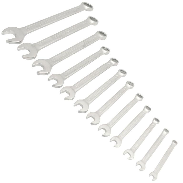1 Jogo de chaves combinadas, composto por um estojo plástico com 12 peças, sendo: 6 mm, 7 mm, 8 mm, 9 mm, 10 mm, 11 mm, 12 mm, 13 mm, 14 mm, 17 mm, 19 mm e 22 mm.