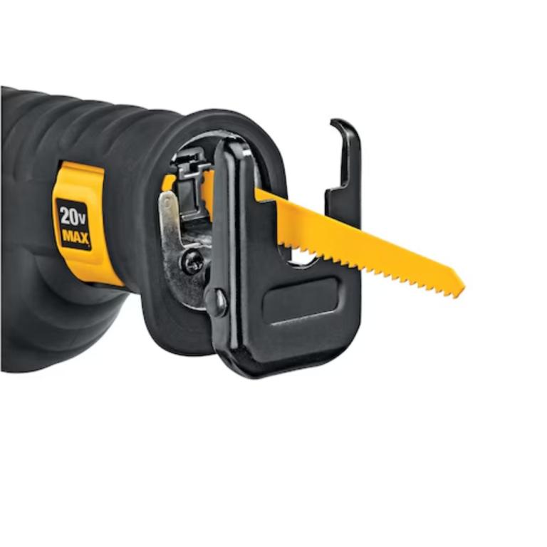 Serra Sabre 20V MAX* LI-ION conta com: 4 posições para instalação da lâmina. Tem engate rápido da lâmina sem uso de chave; Motor robusto com escovas de carvão substituíveis; Empunhadura emborrachada; Interruptor com controle de velocidade variável e gatilho com trava de segurança; Sapata ajustável e pivotante e Freio elétrico.